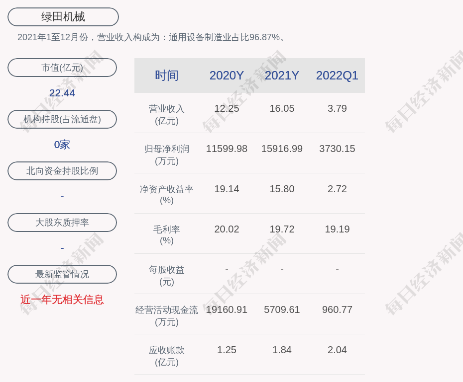 每经AI快讯,绿田机械(SH 605259,收盘价:25.5元)4月28日晚间发布一季度业绩公告称,2022年第一季度营收约3.79亿元;净利润约3730万元。