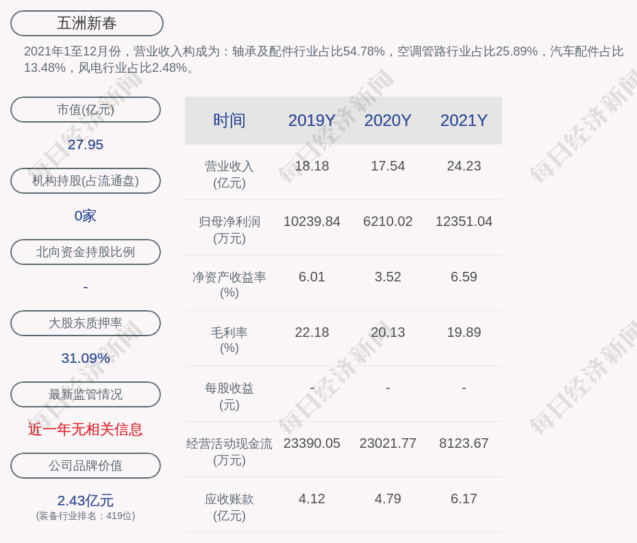 2021年1至12月份,五洲新春的营业收入构成为:轴承及配件行业占比54.78%,空调管路行业占比25.89%,汽车配件占比13.48%,风电行业占比2.48%。