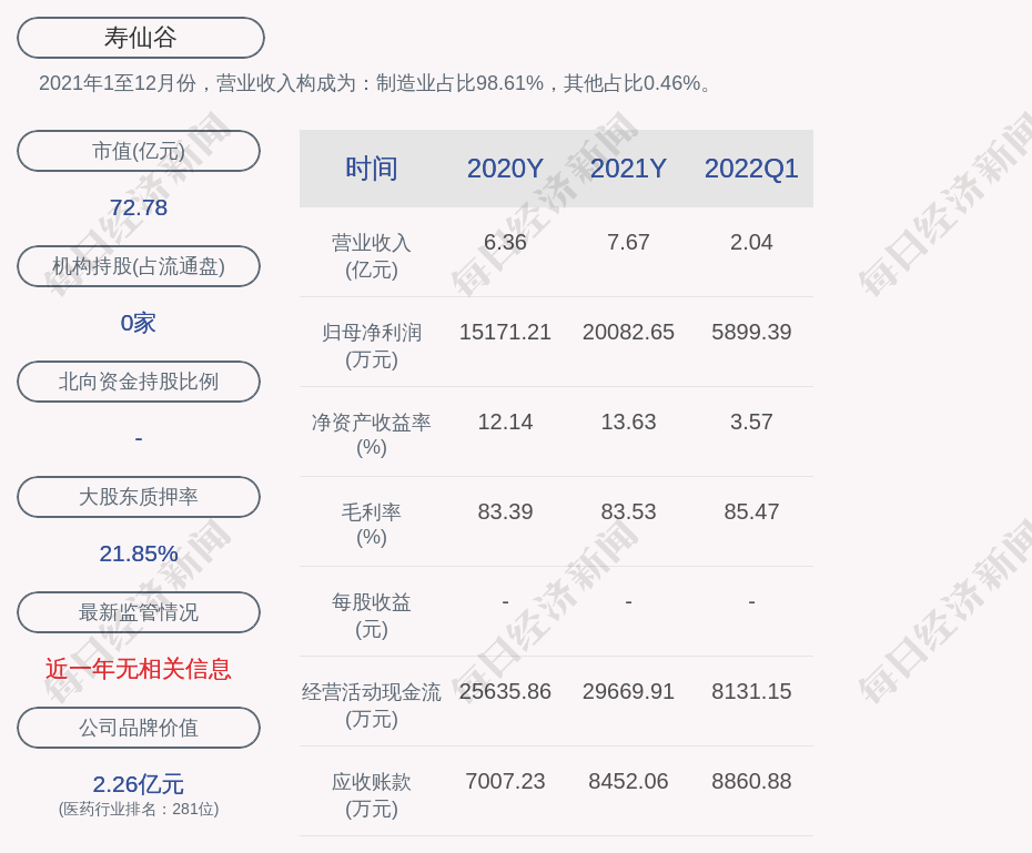 2021年1至12月份,寿仙谷的营业收入构成为:制造业占比98.61%,其他占比0.46%。
