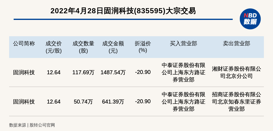 每经讯,2022年4月28日,新三板基础层公司固润科技(835595)发生2笔大宗交易,总成交金额为2128.93万元,成交金额最高的一笔成交价12.64元/股,成交数量117.69万股,成交金额1487.54万元,折价20.9%。买入营业部是中泰证券股份有限公司上海东方路证券营业部,卖出营业部是湘财证券股份有限公司北京分公司。