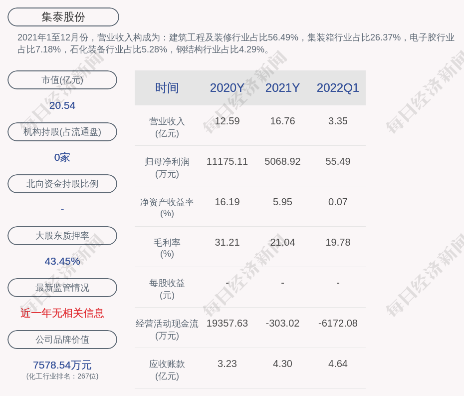 2021年1至12月份,集泰股份的营业收入构成为:建筑工程及装修行业占比56.49%,集装箱行业占比26.37%,电子胶行业占比7.18%,石化装备行业占比5.28%,钢结构行业占比4.29%。