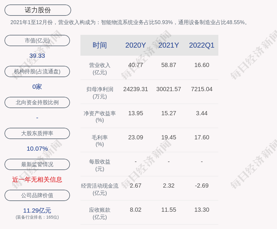 2021年1至12月份,诺力股份的营业收入构成为:智能物流系统业务占比50.93%,通用设备制造业占比48.55%。