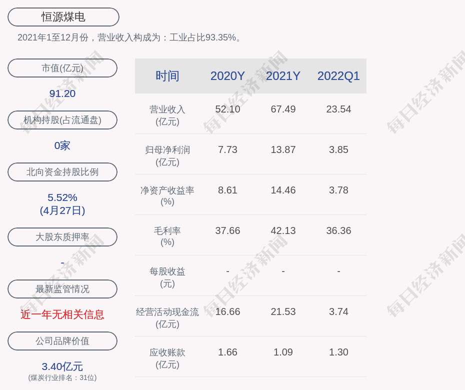 每经AI快讯,恒源煤电(SH 600971,收盘价:7.6元)4月28日晚间发布一季度业绩公告称,2022年第一季度营收约23.54亿元,同比增加47.1%;净利润约3.85亿元,同比增加51.2%。