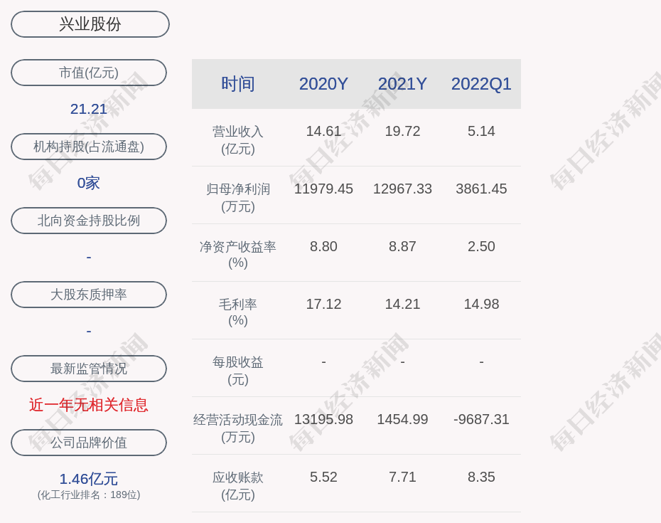 每经AI快讯,兴业股份(SH 603928,收盘价:10.52元)4月28日晚间发布一季度业绩公告称,2022年第一季度营收约5.14亿元;净利润约3861万元。