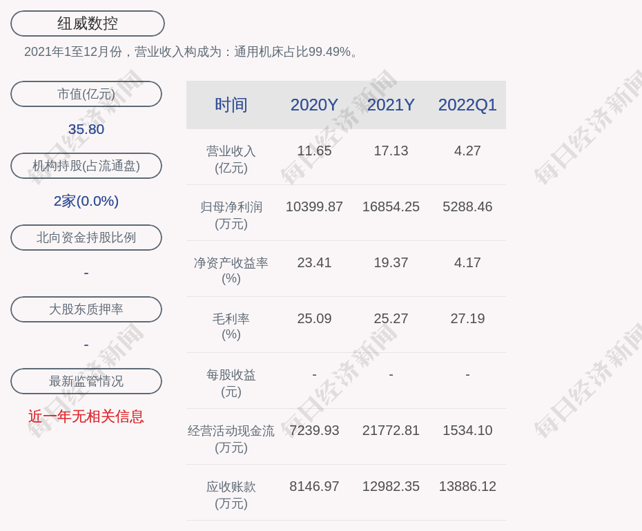 2021年1至12月份,纽威数控的营业收入构成为:通用机床占比99.49%。