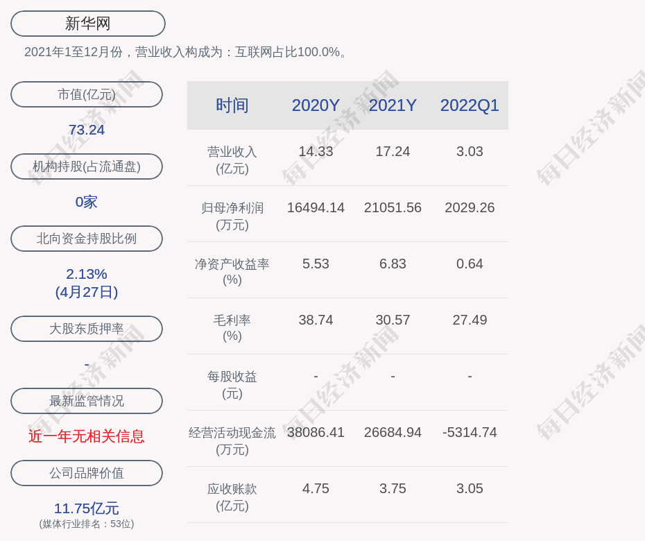 每经AI快讯,新华网(SH 603888,收盘价:14.11元)4月28日晚间发布一季度业绩公告称,2022年第一季度营收约3.03亿元;净利润约2029万元;基本每股收益0.0391元。