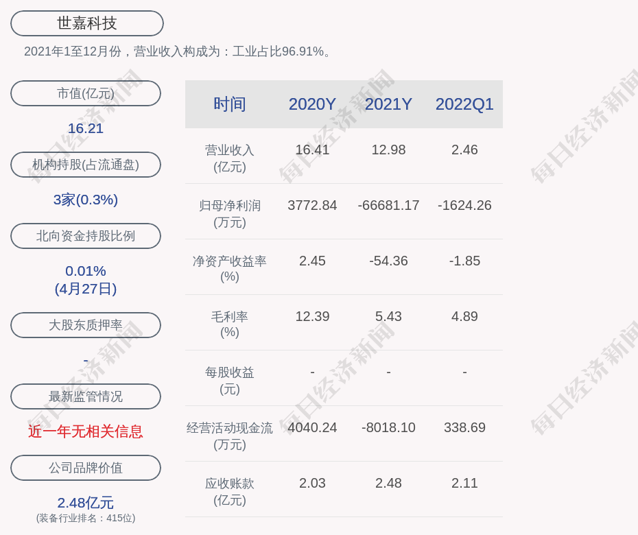 每经AI快讯,世嘉科技(SZ 002796,收盘价:6.42元)4月28日晚间发布一季度业绩公告称,2022年第一季度营收约2.46亿元,同比减少26.68%;净利润亏损约1624万元;基本每股收益亏损0.06元;上年同期营收约3.35亿元;净利润亏损约430万元;基本每股收益亏损0.02元。
