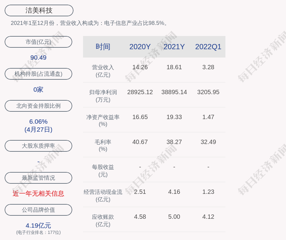 每经AI快讯,洁美科技(SZ 002859,收盘价:22.07元)4月28日晚间发布一季度业绩公告称,2022年第一季度营收约3.28亿元,同比减少24.93%;净利润约3206万元,同比减少65.93%;基本每股收益0.08元,同比减少65.22%。