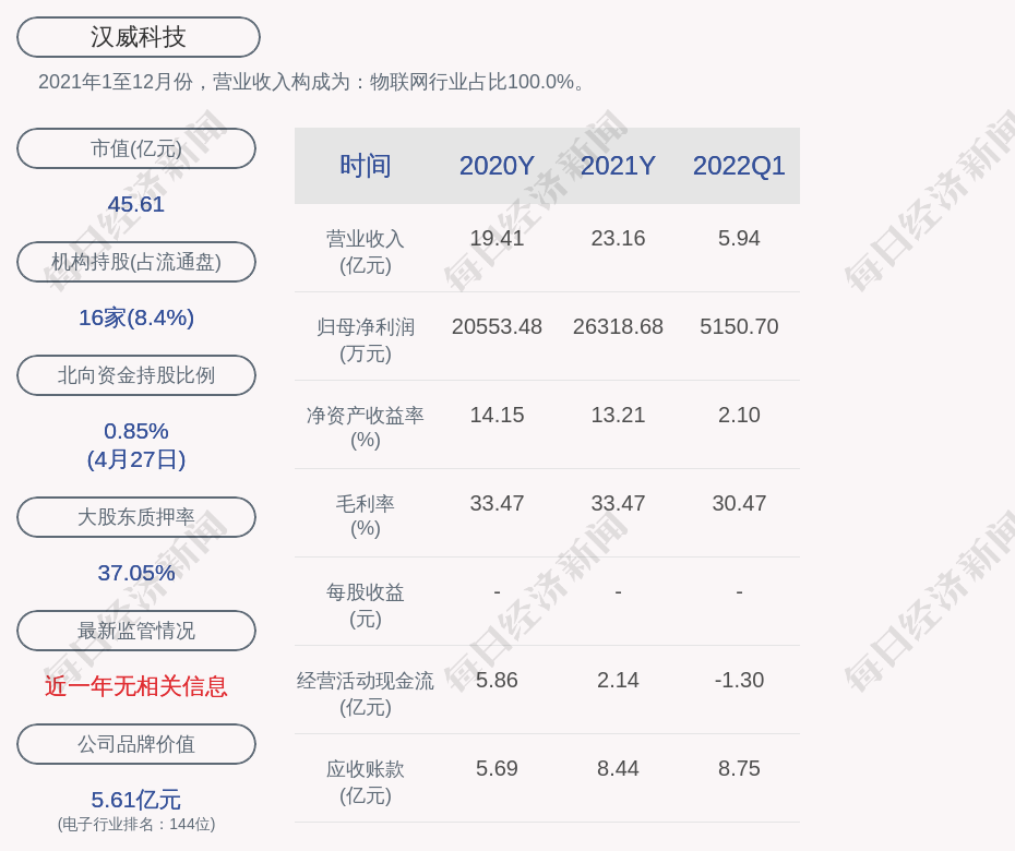 2021年1至12月份,汉威科技的营业收入构成为:物联网行业占比100.0%。