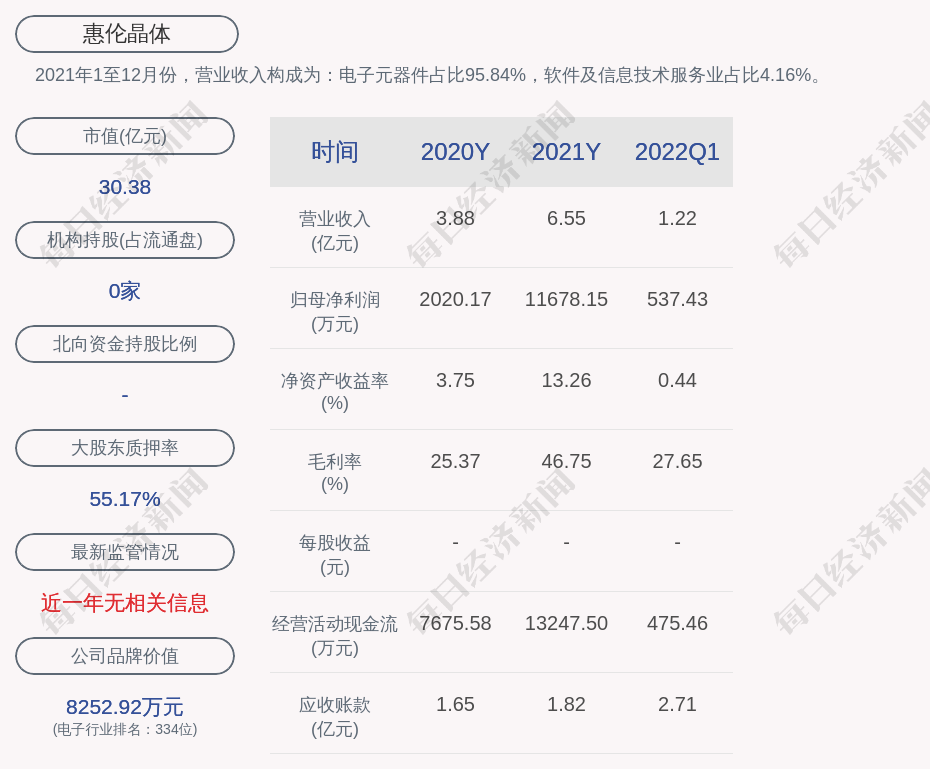2021年1至12月份,惠伦晶体的营业收入构成为:电子元器件占比95.84%,软件及信息技术服务业占比4.16%。