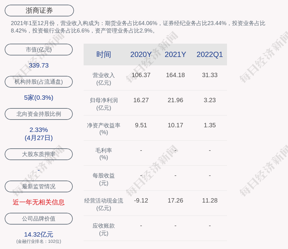 2021年1至12月份,浙商证券的营业收入构成为:期货业务占比64.06%,证券经纪业务占比23.44%,投资业务占比8.42%,投资银行业务占比6.6%,资产管理业务占比2.9%。