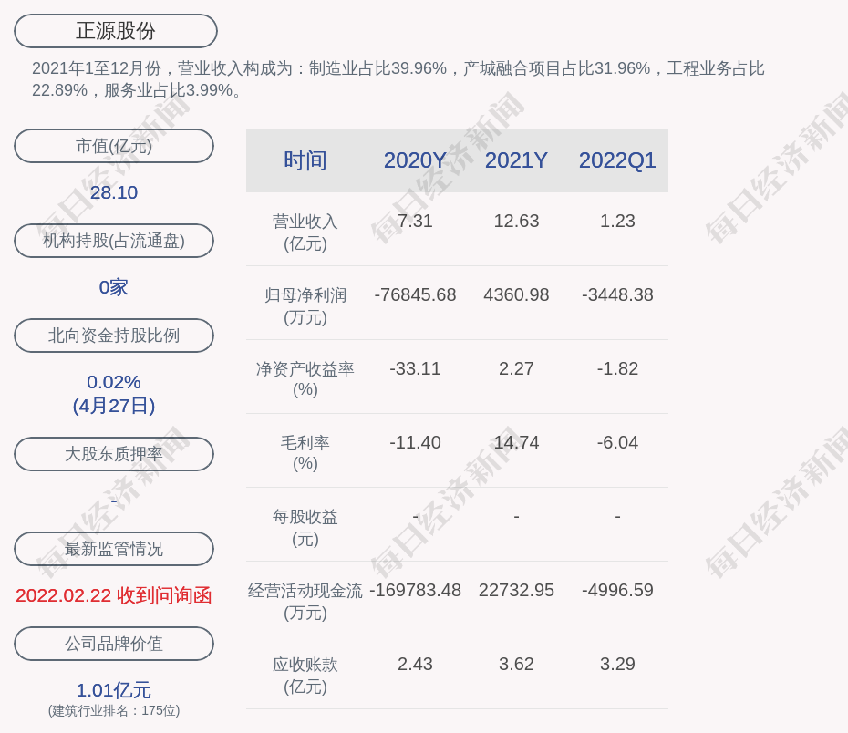 每经AI快讯,正源股份(SH 600321,收盘价:1.86元)4月28日晚间发布一季度业绩公告称,2022年第一季度营收约1.23亿元;归属于上市公司股东的净利润亏损约3448万元;基本每股收益亏损0.0228元。