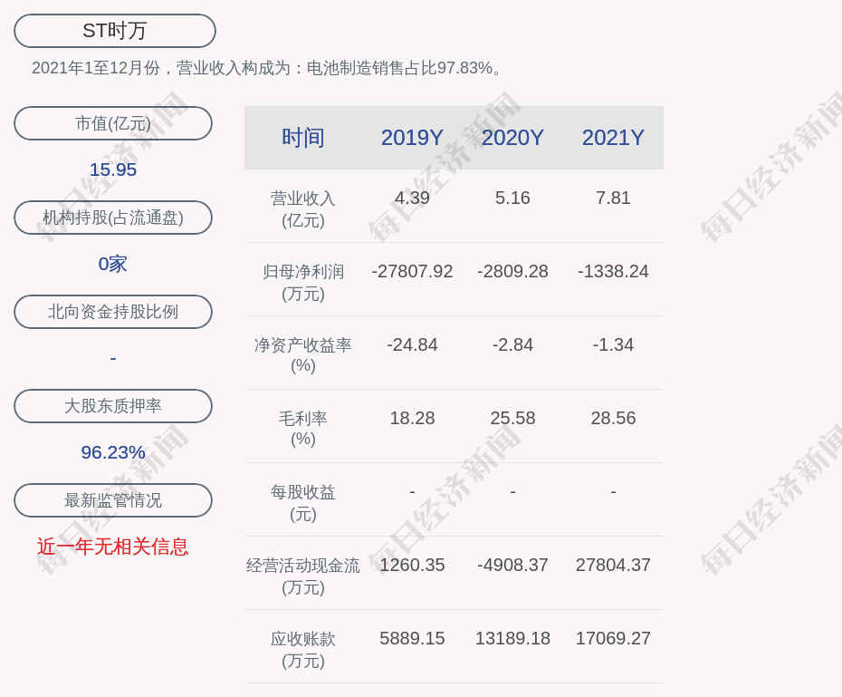 2021年1至12月份,ST时万的营业收入构成为:电池制造销售占比97.83%。