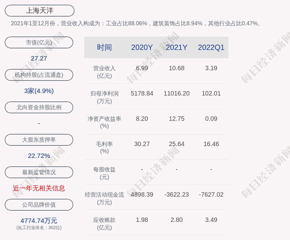 每经AI快讯,上海天洋(SH 603330,收盘价:11.47元)4月28日晚间发布一季度业绩公告称,2022年第一季度营收约3.19亿元;归属于上市公司股东的净利润约102万元;基本每股收益0.004元。