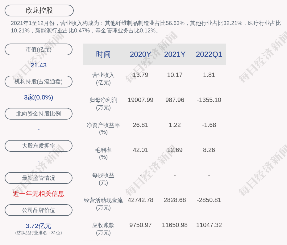 2021年1至12月份,欣龙控股的营业收入构成为:其他纤维制品制造业占比56.63%,其他行业占比32.21%,医疗行业占比10.21%,新能源行业占比0.47%,基金管理业务占比0.12%。