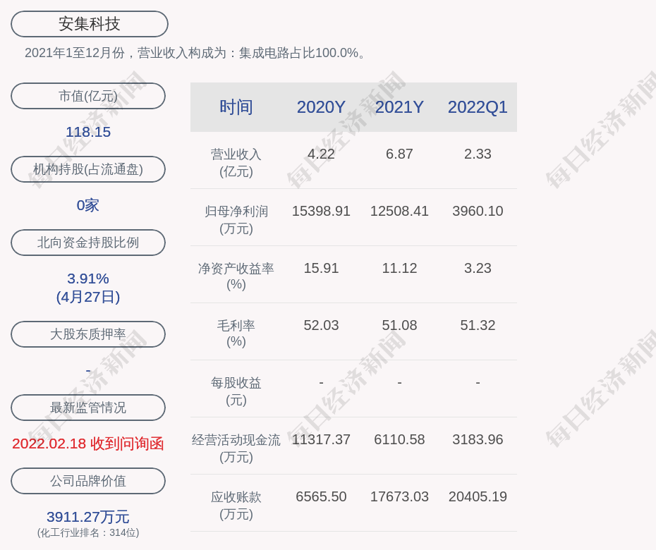 2021年1至12月份,安集科技的营业收入构成为:集成电路占比100.0%。