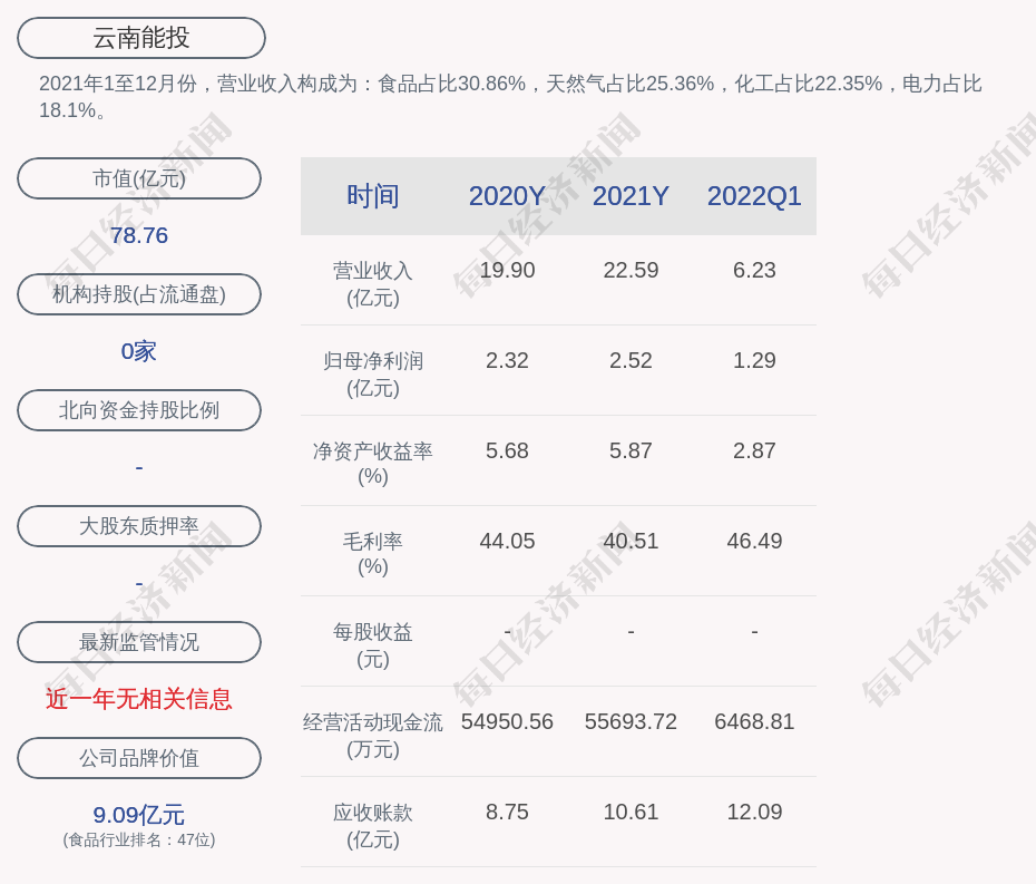 2021年1至12月份,云南能投的营业收入构成为:食品占比30.86%,天然气占比25.36%,化工占比22.35%,电力占比18.1%。