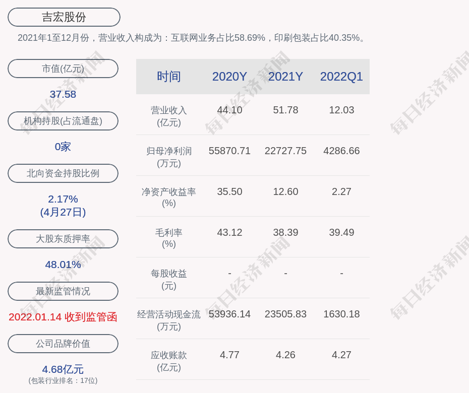 2021年1至12月份,吉宏股份的营业收入构成为:互联网业务占比58.69%,印刷包装占比40.35%。