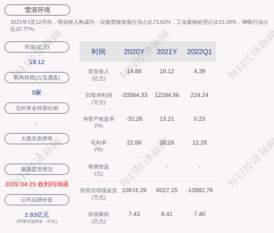 2021年1至12月份,雪浪环境的营业收入构成为:垃圾焚烧发电行业占比73.62%,工业废物处理占比15.26%,钢铁行业占比10.77%。