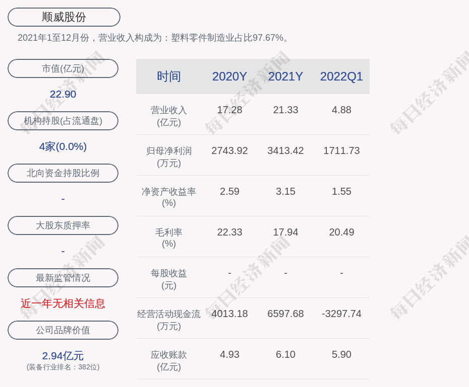 2021年1至12月份,顺威股份的营业收入构成为:塑料零件制造业占比97.67%。