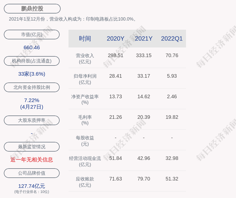 每经AI快讯,鹏鼎控股(SZ 002938,收盘价:28.45元)4月28日晚间发布一季度业绩公告称,2022年第一季度营收约70.76亿元,同比增加24.4%;归属于上市公司股东的净利润约5.93亿元,同比增加68.97%;基本每股收益0.26元,同比增加73.33%。