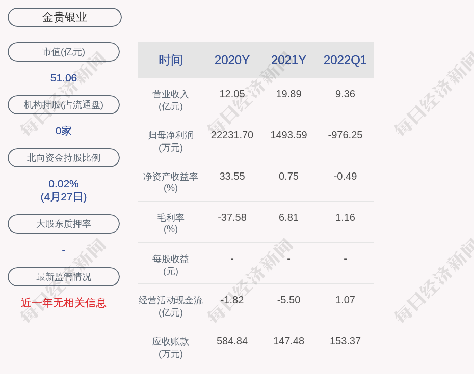 每经AI快讯,金贵银业(SZ 002716,收盘价:2.31元)4月28日晚间发布一季度业绩公告称,2022年第一季度营收约9.36亿元,同比增加48456.4%;归属于上市公司股东的净利润亏损约976万元;基本每股收益亏损0.0044元。