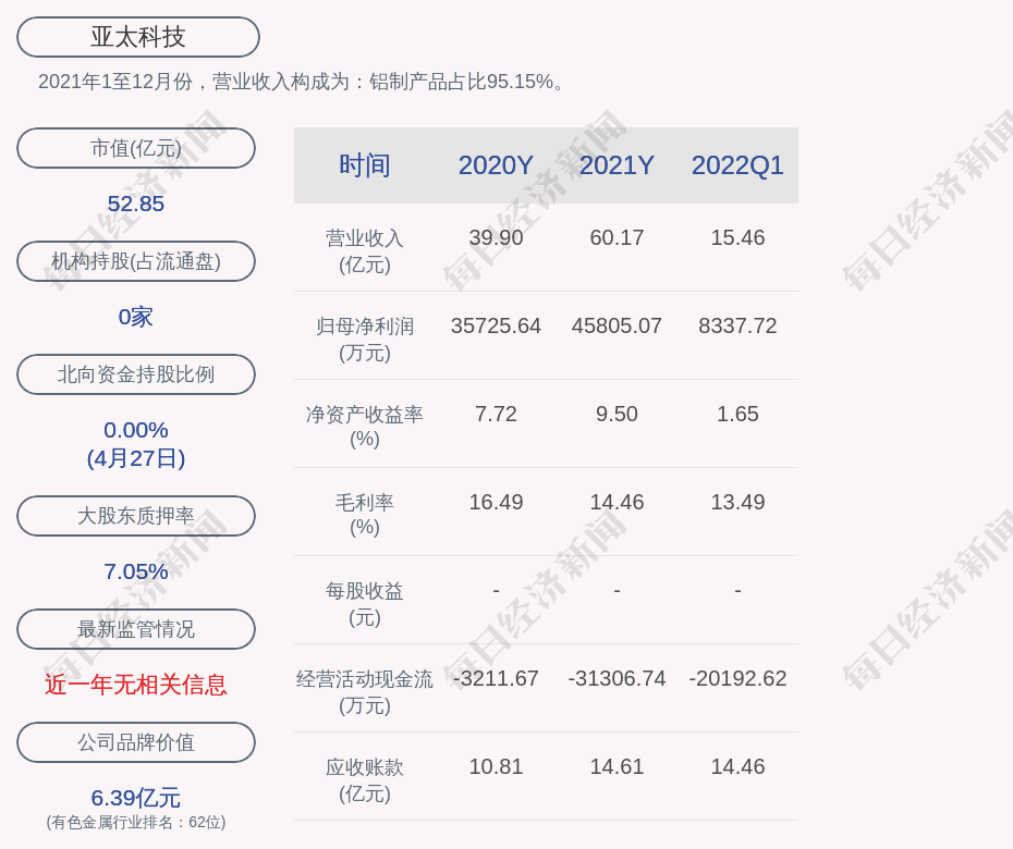 2021年1至12月份,亚太科技的营业收入构成为:铝制产品占比95.15%。