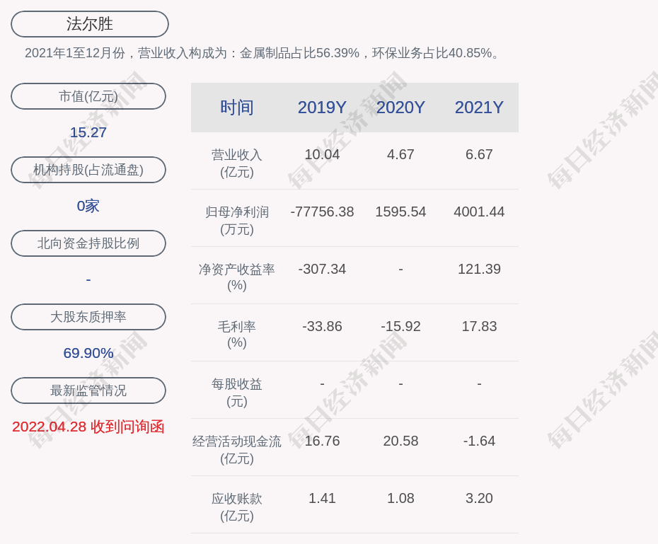 2021年1至12月份,法尔胜的营业收入构成为:金属制品占比56.39%,环保业务占比40.85%。