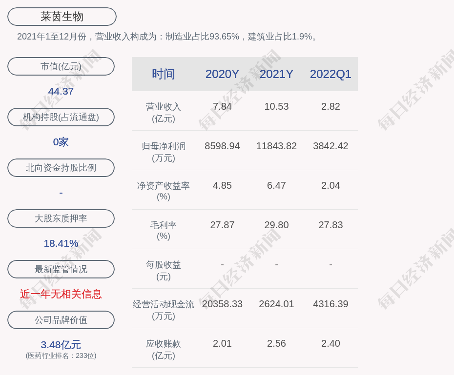 2021年1至12月份,莱茵生物的营业收入构成为:制造业占比93.65%,建筑业占比1.9%。