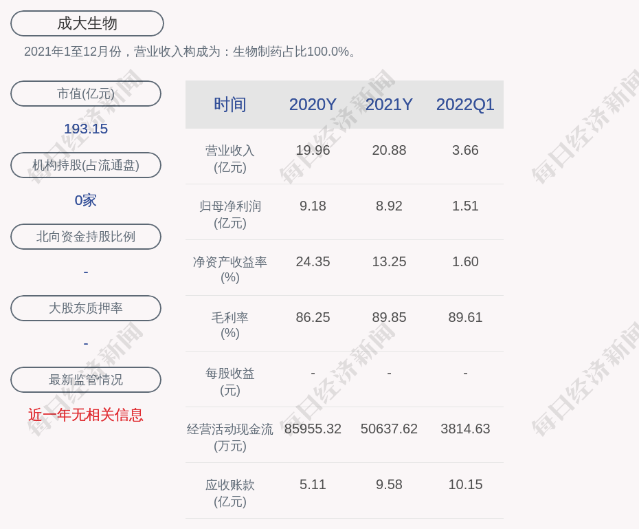 2021年1至12月份,成大生物的营业收入构成为:生物制药占比100.0%。