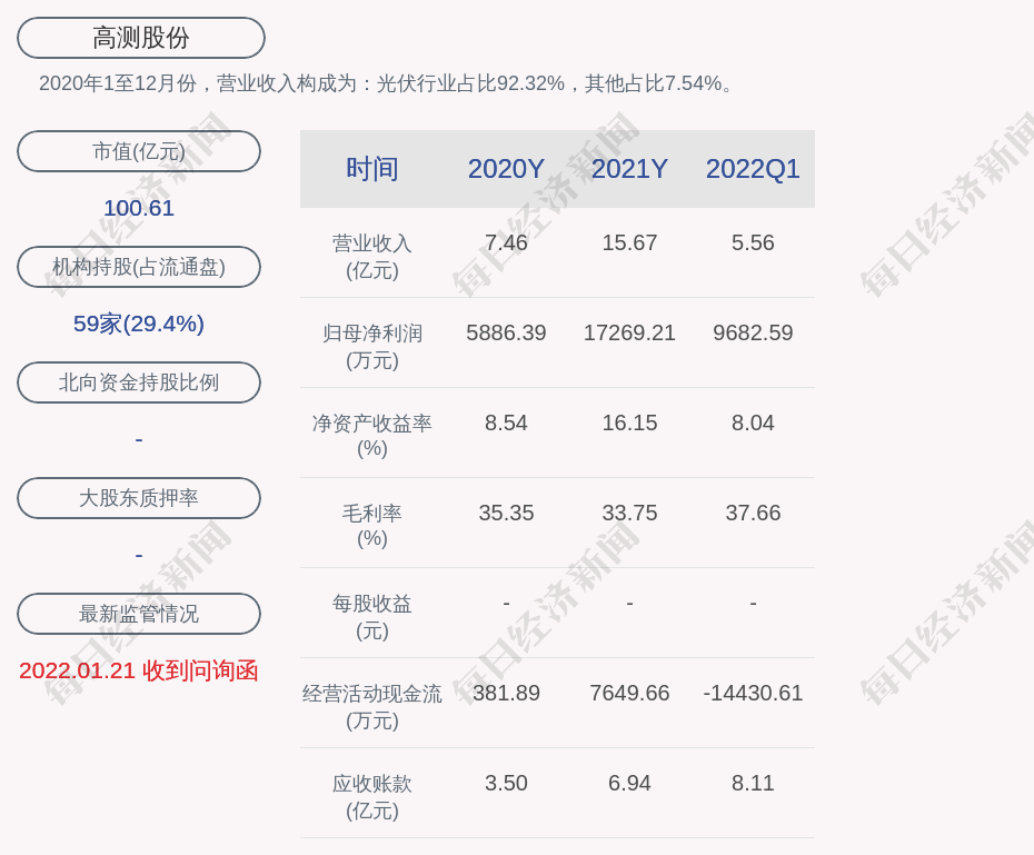 2020年1至12月份,高测股份的营业收入构成为:光伏行业占比92.32%,其他占比7.54%。