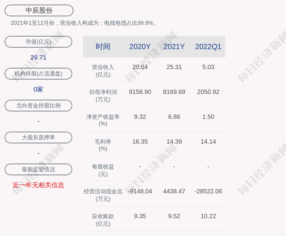 2021年1至12月份,中辰股份的营业收入构成为:电线电缆占比99.9%。