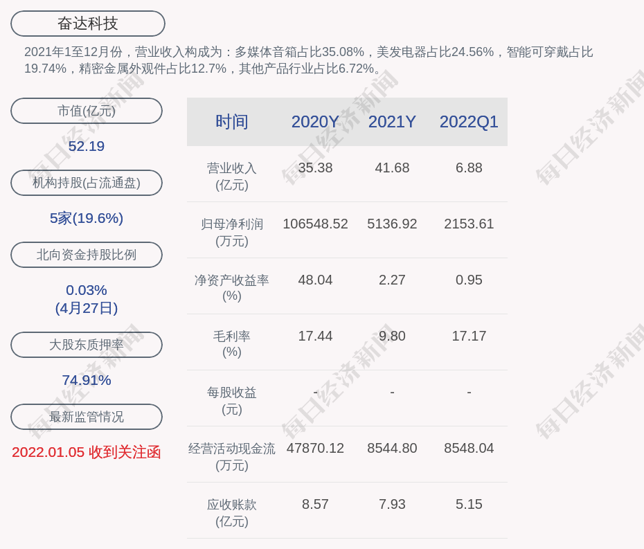 2021年1至12月份,奋达科技的营业收入构成为:多媒体音箱占比35.08%,美发电器占比24.56%,智能可穿戴占比19.74%,精密金属外观件占比12.7%,其他产品行业占比6.72%。
