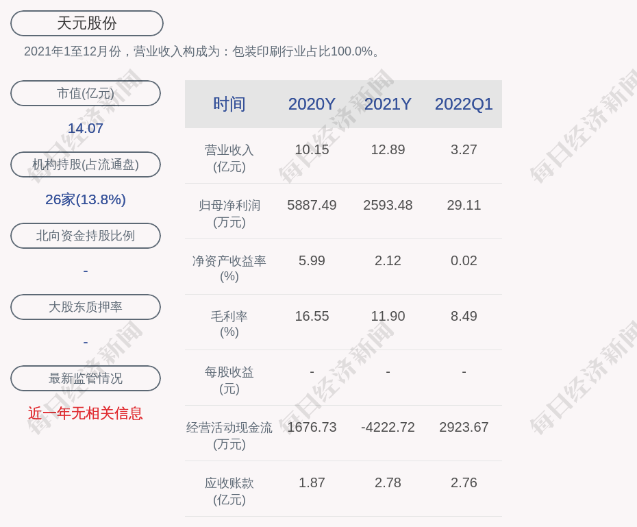 2021年1至12月份,天元股份的营业收入构成为:包装印刷行业占比100.0%。