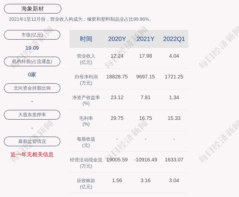 2021年1至12月份,海象新材的营业收入构成为:橡胶和塑料制品业占比99.86%。