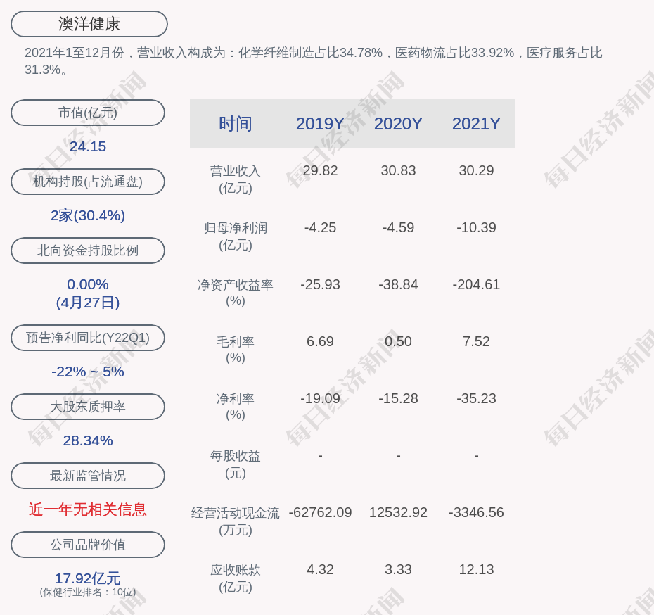 每经AI快讯,澳洋健康(SZ 002172,收盘价:3.11元)4月28日晚间发布年度业绩报告称,2021年营业收入约30.29亿元,同比减少1.77%;归属于上市公司股东的净利润亏损约10.39亿元;基本每股收益亏损1.34元。拟不派现、不送红股、不转增。2020年同期营业收入约30.83亿元;归属于上市公司股东的净利润亏损约4.59亿元;基本每股收益亏损0.59元。
