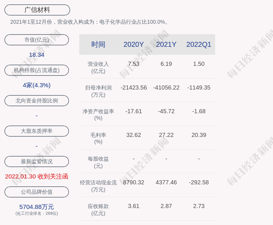 2021年1至12月份,广信材料的营业收入构成为:电子化学品行业占比100.0%。