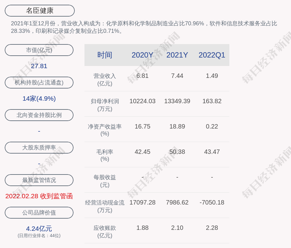 2021年1至12月份,名臣健康的营业收入构成为:化学原料和化学制品制造业占比70.96%,软件和信息技术服务业占比28.33%,印刷和记录媒介复制业占比0.71%。