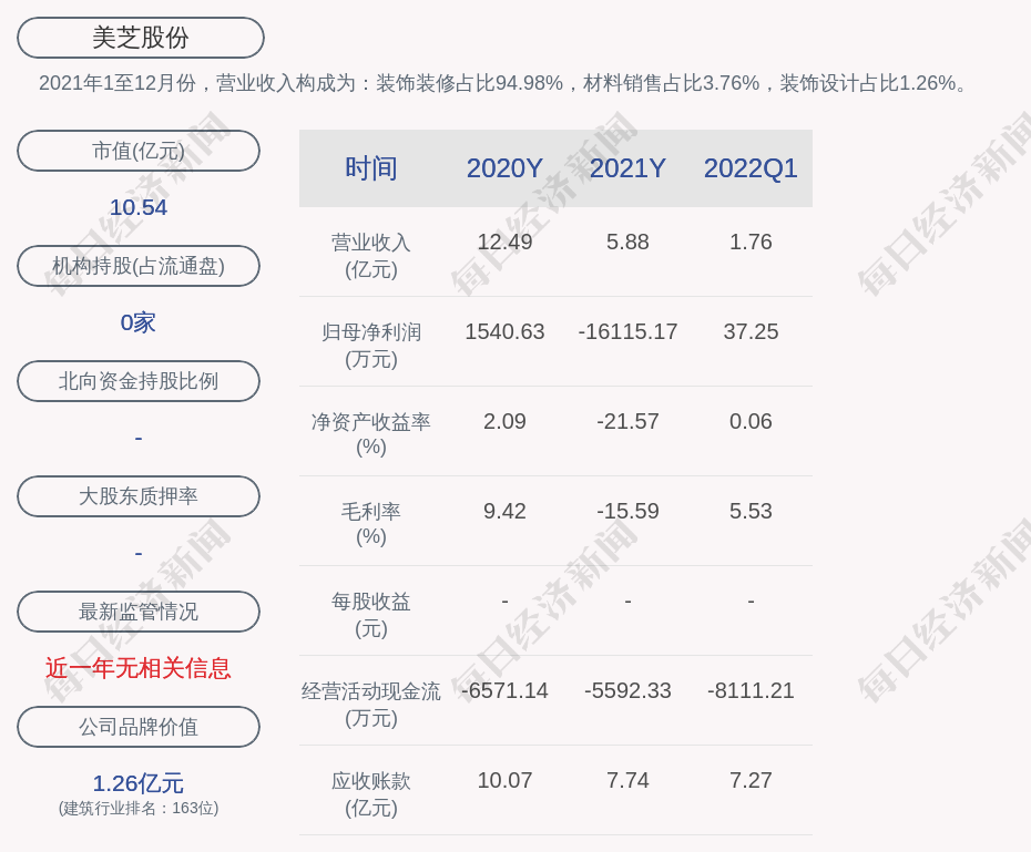 2021年1至12月份,美芝股份的营业收入构成为:装饰装修占比94.98%,材料销售占比3.76%,装饰设计占比1.26%。