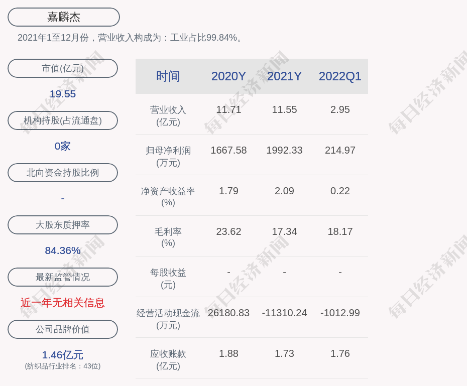 2021年1至12月份,嘉麟杰的营业收入构成为:工业占比99.84%。