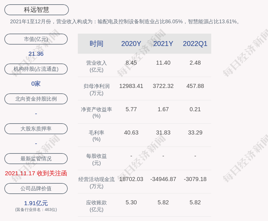 2021年1至12月份,科远智慧的营业收入构成为:输配电及控制设备制造业占比86.05%,智慧能源占比13.61%。