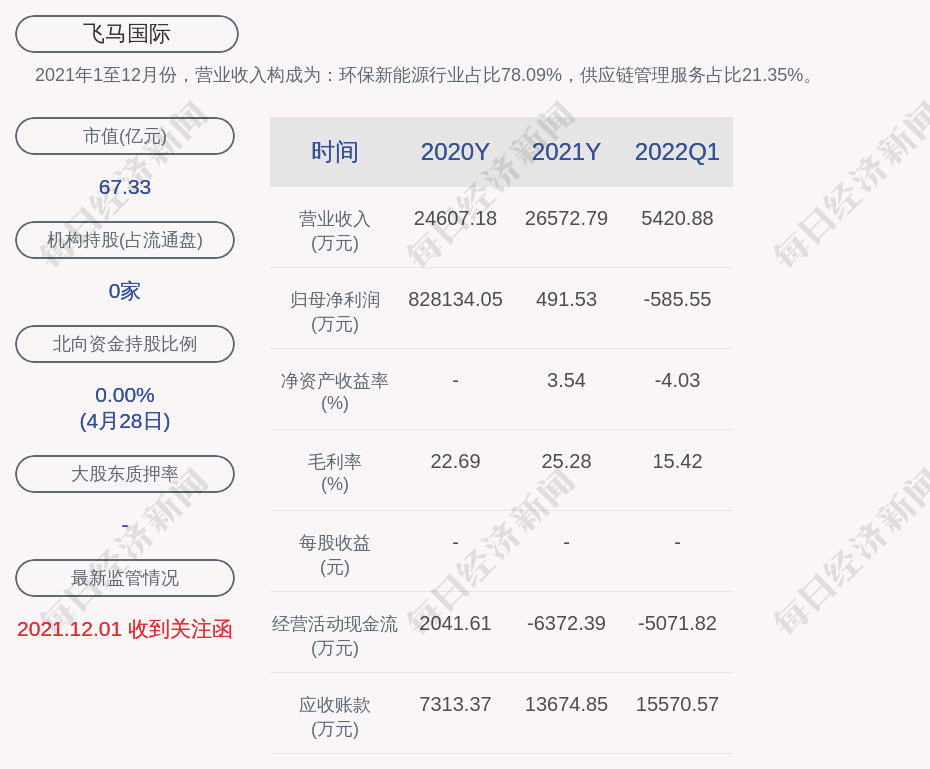 每经AI快讯,飞马国际(SZ 002210,收盘价:2.53元)4月28日晚间发布一季度业绩公告称,2022年第一季度营收约5421万元,同比减少7.96%;归属于上市公司股东的净利润亏损约586万元;基本每股收益亏损0.0022元。