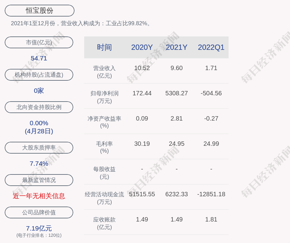 每经AI快讯,恒宝股份(SZ 002104,收盘价:7.85元)4月28日晚间发布一季度业绩公告称,2022年第一季度营收约1.71亿元,同比减少12.9%;归属于上市公司股东的亏损约505万元;基本每股亏损0.0072元。