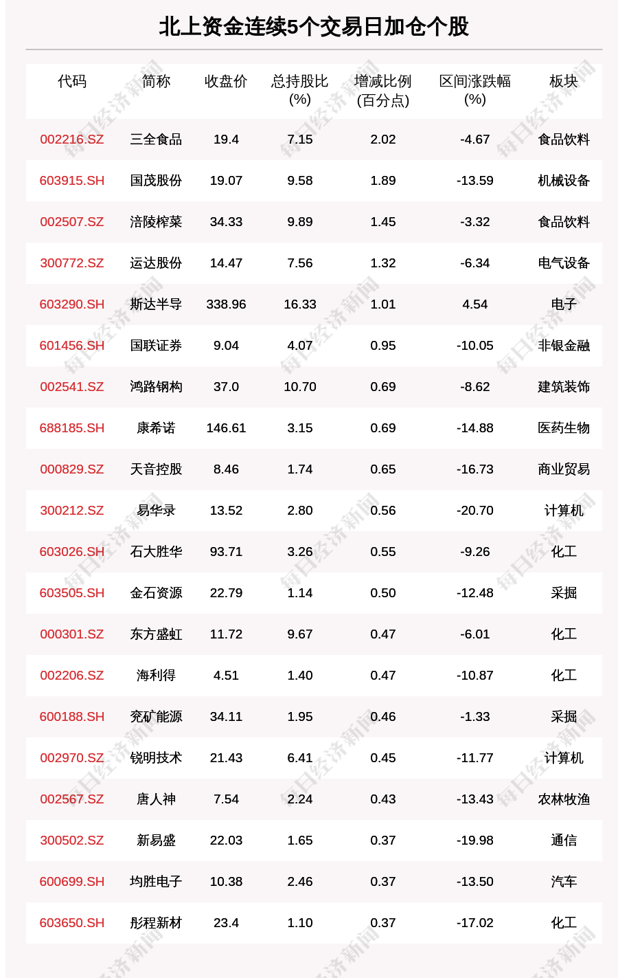 每经AI快讯,4月28日,北上资金连续5个交易日买入55个股。北上资金连续5个交易日加仓个股中,三全食品(002216.SZ,收盘价:19.4元)增持比例增幅最大,5个交易日增持2.02个百分点,其他增持比例较大的个股包括国茂股份(603915.SH,收盘价:19.07元)、涪陵榨菜(002507.SZ,收盘价:34.33元)、运达股份(300772.SZ,收盘价:14.47元),分别增持1.89个百分点、1.45个百分点、1.32个百分点。