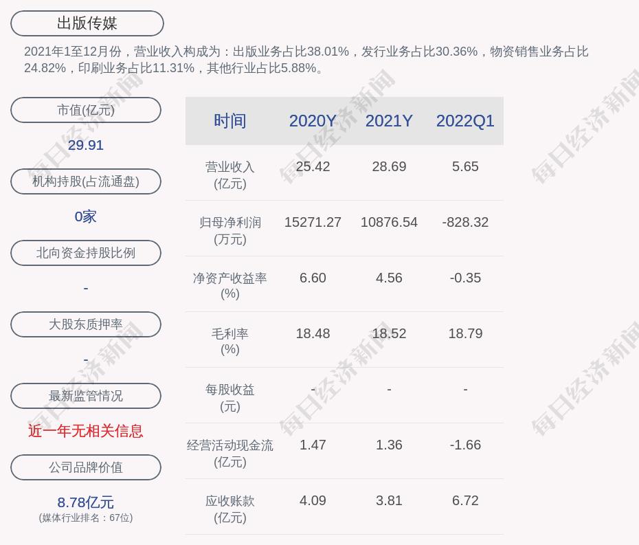每经AI快讯,出版传媒(SH 601999,收盘价:5.43元)4月29日晚间发布年度业绩报告称,2021年营业收入约28.69亿元,同比增加12.85%;归属于上市公司股东的净利润约1.09亿元,同比减少28.78%;基本每股收益0.2元,同比减少28.57%。拟每10股派发现金红利0.6元(含税)。