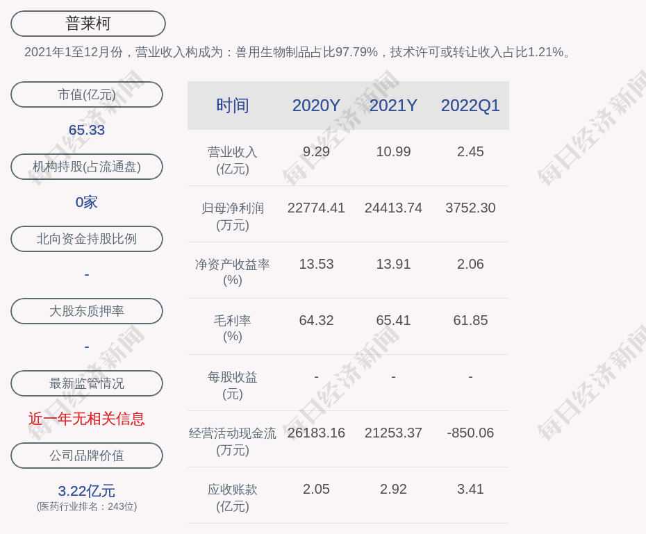 每经AI快讯,普莱柯(SH 603566,收盘价:20.32元)4月29日晚间发布一季度业绩公告称,2022年第一季度营收约2.45亿元;归属于上市公司股东的净利润约3752万元;基本每股收益0.12元。