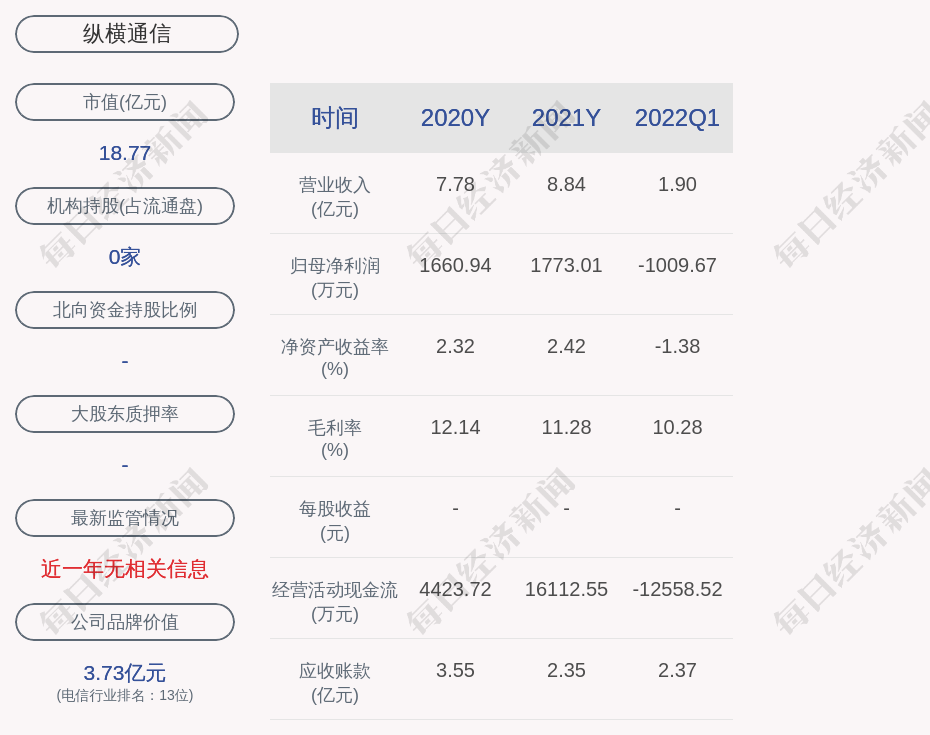 每经AI快讯,纵横通信(SH 603602,收盘价:9.21元)4月29日晚间发布一季度业绩公告称,2022年第一季度营收约1.9亿元;归属于上市公司股东的净利润亏损约1010万元;基本每股收益亏损0.05元。