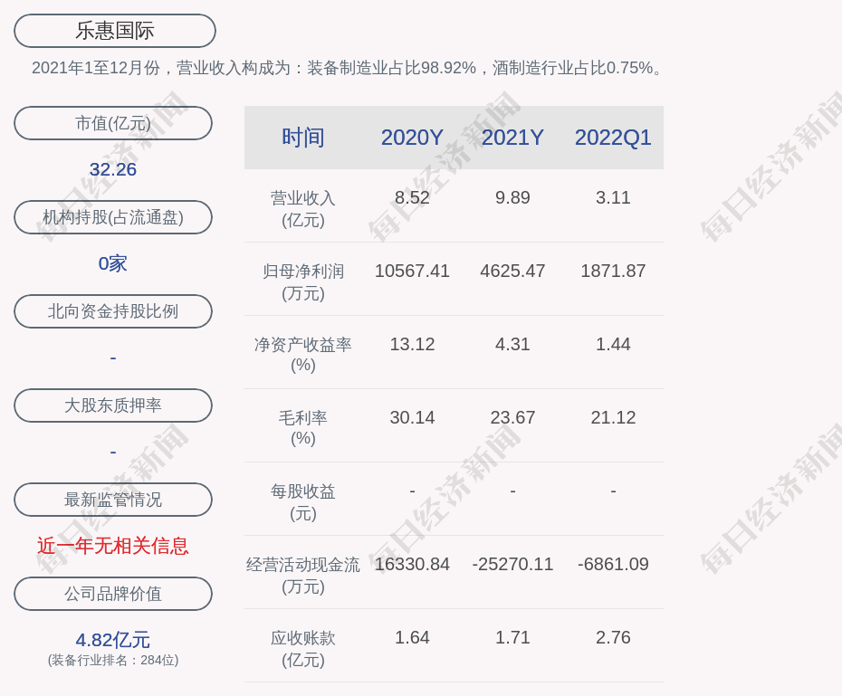 2021年1至12月份,乐惠国际的营业收入构成为:装备制造业占比98.92%,酒制造行业占比0.75%。