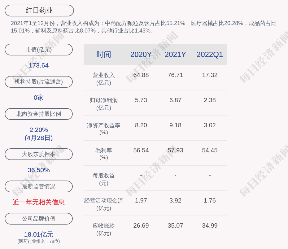 2021年1至12月份,红日药业的营业收入构成为:中药配方颗粒及饮片占比55.21%,医疗器械占比20.28%,成品药占比15.01%,辅料及原料药占比8.07%,其他行业占比1.43%。