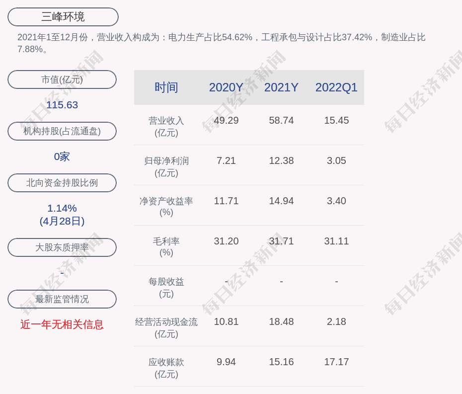 2021年1至12月份,三峰环境的营业收入构成为:电力生产占比54.62%,工程承包与设计占比37.42%,制造业占比7.88%。